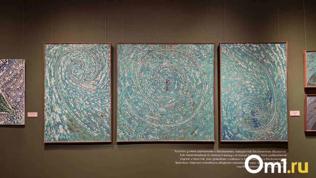 «Космос у меня безграничен и бесконечен, не вызывает мистического или страшного ощущения…» — пояснял Геннадий Райшев в одном из интервью. Для художника космос — это бесконечное движение. Состояние перемен. Самой гипнотизирующей картиной на выставке является триптих «Космос и человек».