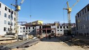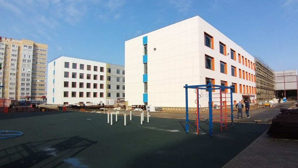 Завершаются строительные работы. Снаружи монтируются цветные фасады, устанавливаются окна. Внутри здания выполняется отделка спортивного и актового залов, в классах проводятся малярные работы. Кроме того, на прилегающей территории укладывают резиновое покрытие на спортивной площадке.